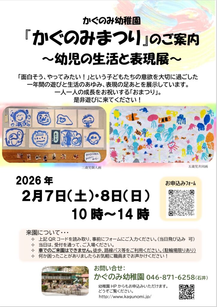 お知らせ かぐのみまつり開催のご案内 2026年1月26日 kagunomiyochien 幼児の生活と表現展 令和8年2月7日(土)10:00~15:00、8日(日)9:00~14:00 ↓↓参観希望の方は、下記フォームよりお申込みください↓↓ 2025年度かぐのみまつり参観申込フォーム みなさまのご来園をお待ちしております!
